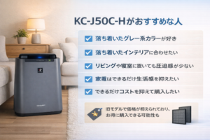 そのため「新しい=劇的に高性能」というわけではありません。安心感や在庫の安定性を重視するならKC-S50-W、コストパフォーマンスを重視するならKC-J50C-Hというように、目的に合わせて選ぶのが賢い方法です。