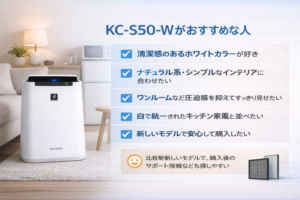「できれば新しめのモデルを選びたい」「白い家電でそろえたい」という方には、KC-S50-Wが満足度の高い選択になるでしょう。見た目の明るさと安心感の両方を重視したい方にぴったりの一台です。